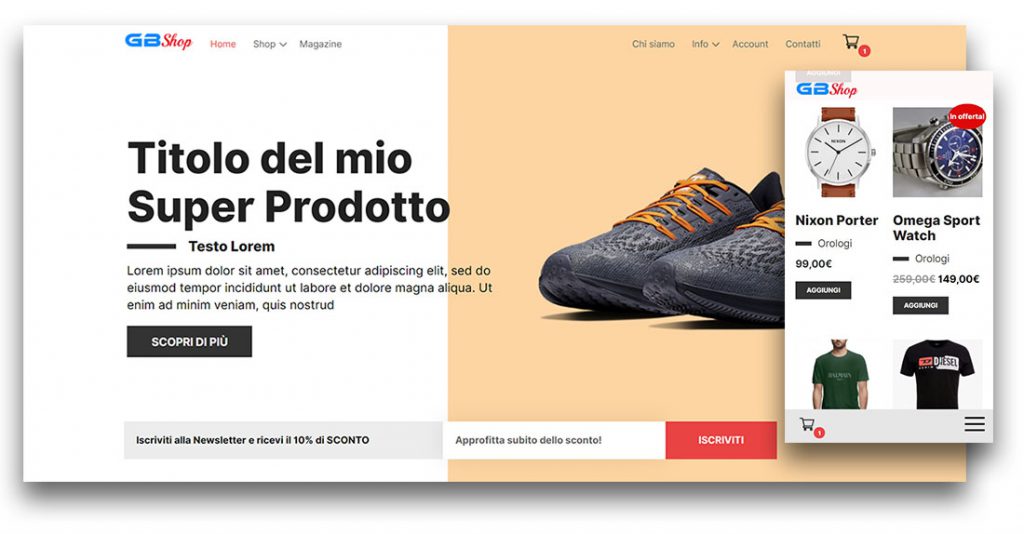 GBshop è un tema custom per e-commerce, un vero e proprio sito demo creato interamente da zero senza l’utilizzo di Page Builder o temi già pronti.