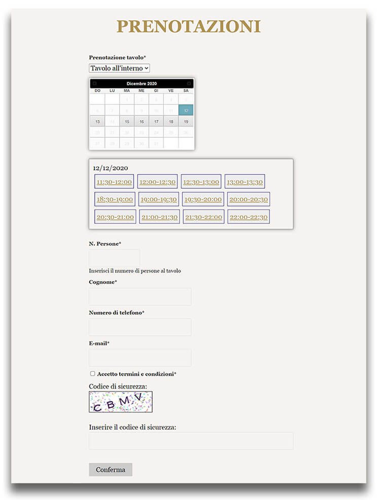 Dopodiché è stato creato un modulo di prenotazione online dove il cliente potrà prenotare in autonomia scegliendo tra un tavolo all’interno o all’esterno del locale ed una fascia oraria.
